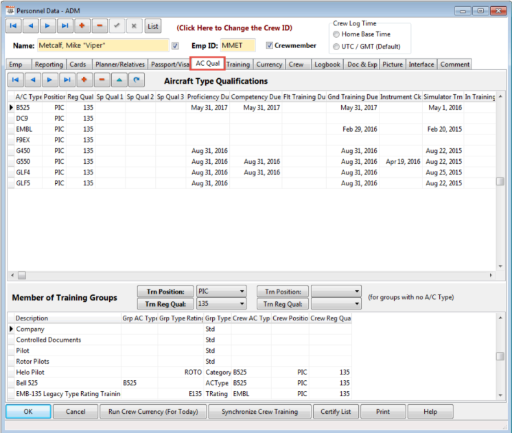 This tab is divided into two sections, Aircraft Type Qualifications and Member of Training Groups.