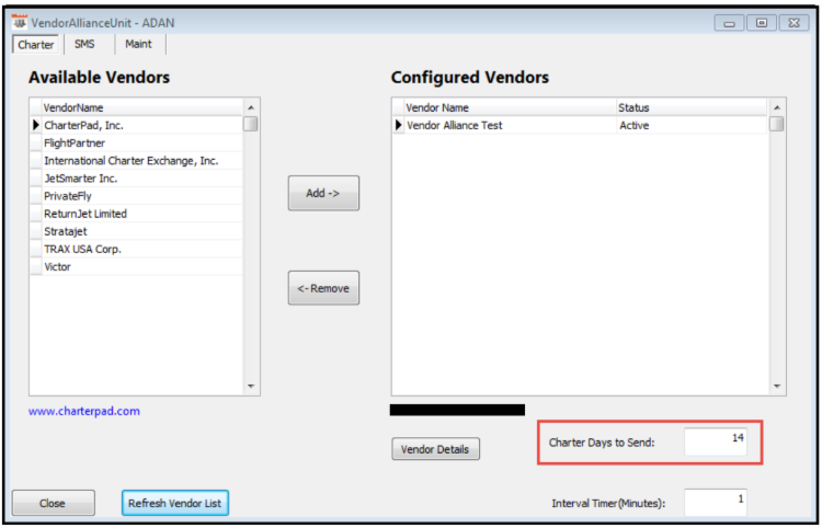 In the Vendor Alliance Module, enter a number of days in the “Charter Days to Send” field. This field allows the user to control how many days forward the schedule is being sent to the selected Charter provider.