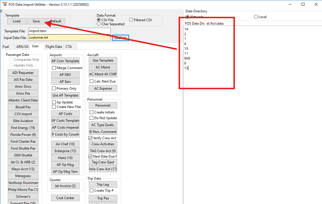 4. Go to the Import Utility and clear everything out of the right side window and start typing all of the codes you have added into the data sheet using one line per code. Then choose save. Name the template, save as a .tem file type.