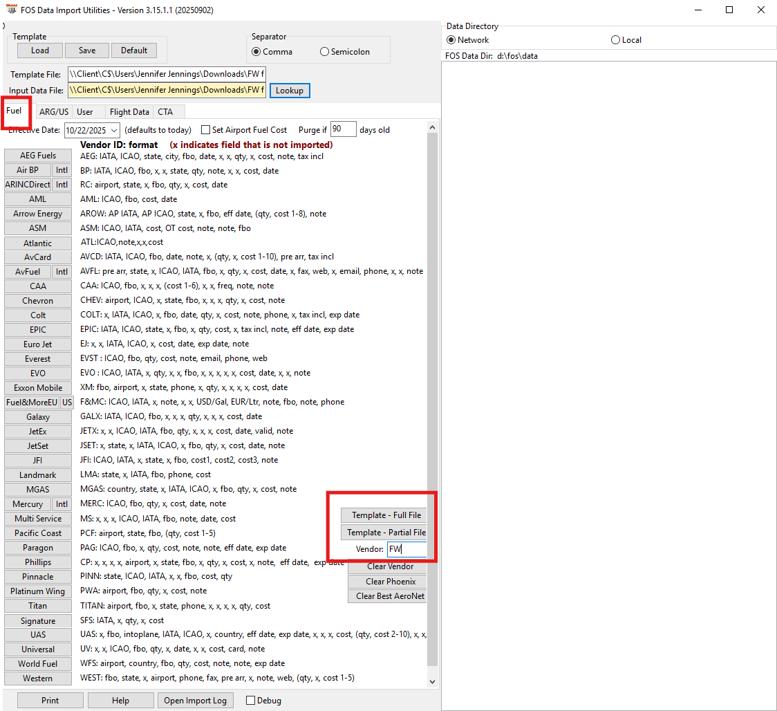 8. For custom fuel vendors that do not have a hot button on the left, select the Template-Full File option on the fuel tab, and add the vendor ID. Once the process is done, "DONE" will be shown at the top.