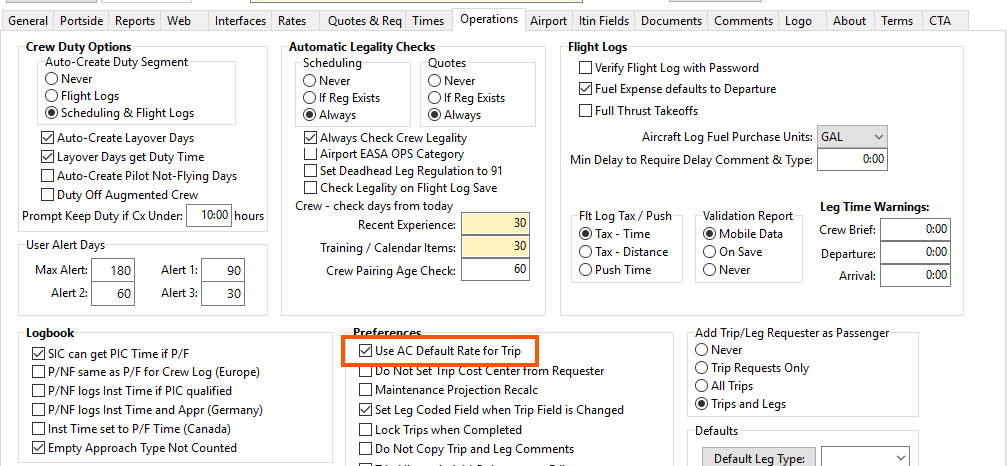 Default A/C Rate – If option is selected on the Operations tab within the Company Data, this will set a rate in the trip when scheduling. This is for 91 operations and chargebacks, this is not for AC rates utilized with quotes. (Below – Company Data/Operations tab/”Use AC Default Rate for Trip”):