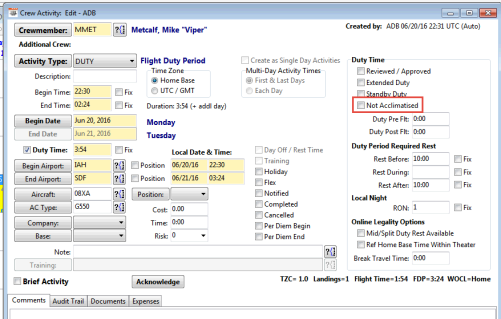 To determine if a crewmember is not acclimatized, the option must be checked in the duty period. “Not Acclimatized” option in the duty period