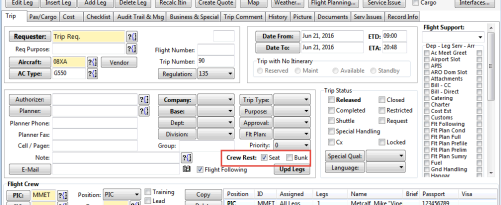 Whether crew rest is accomplished in a seat or a bunk is determined by the check box in the trip notebook.