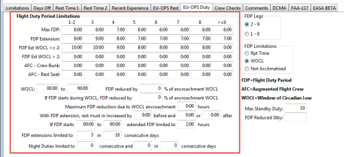 There is a radio button option to set the flight duty period legs either at 2-9 or 1-8 depending upon your needs.