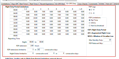 If the table is based on “Report Time”, you may specify the reporting time on the left and then enter the duty period limitation based on the number of legs flown. This table also allows a maximum time for standby duty and a field to reduce the flight duty period based on standby time.