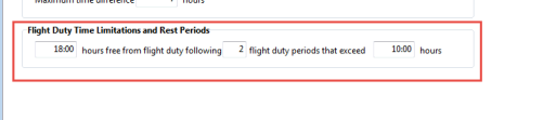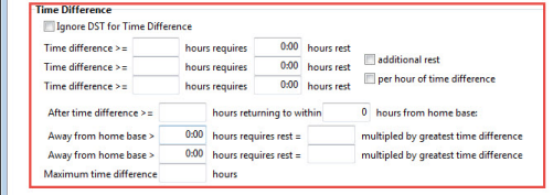 The second section deals with time differences. These rules may be set to require more rest time when crossing a certain number of time zones. You state this difference in a certain number of hours or per hour of time difference or as additional rest depending upon the check box options used. The other option is that when the crewmember is away from the home airport a certain number of hours the rest time may be calculated by multiplying the time zone difference with a maximum.