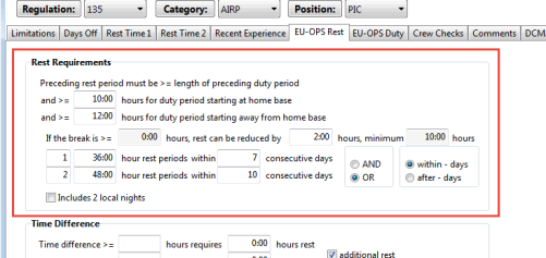The “EU-OPS Rest” is designed to handle rest time requirements that are specific to European operations. Although labeled for European operations, this tab may be used for any regulation if needed and in conjunction with the other rest time tabs.