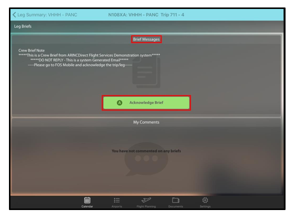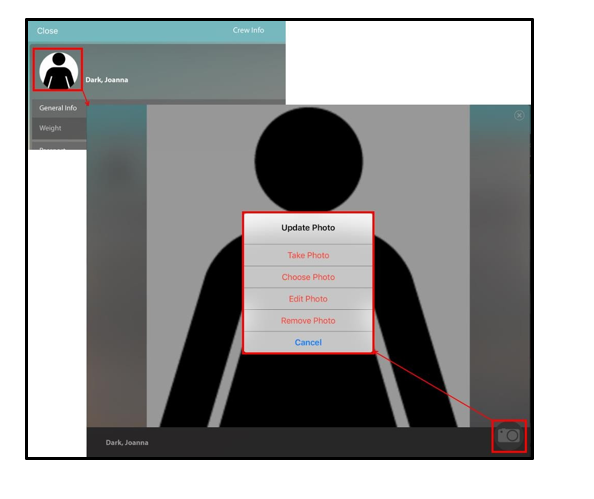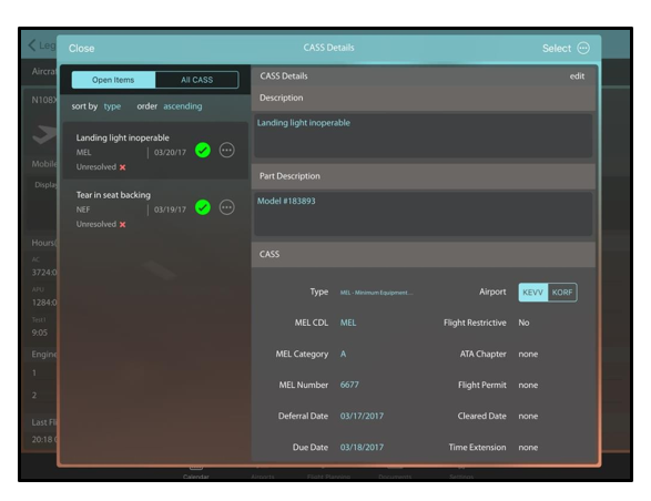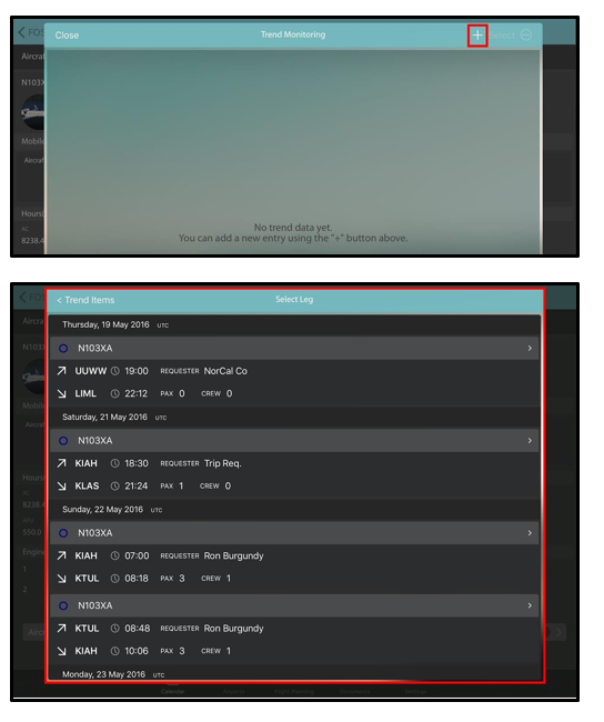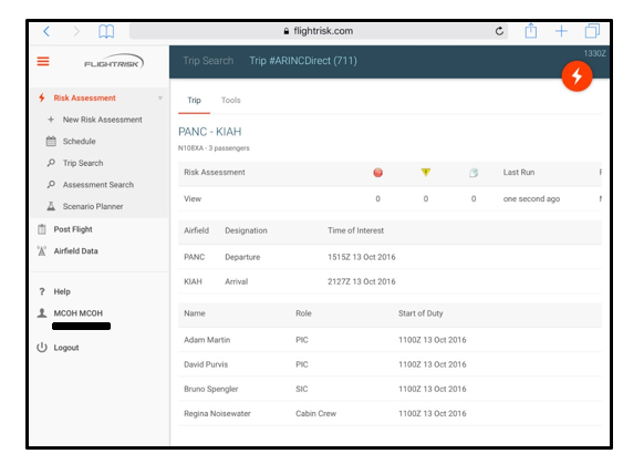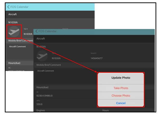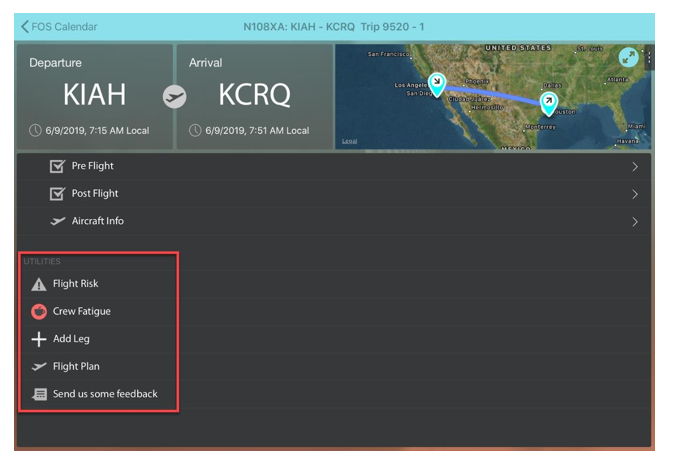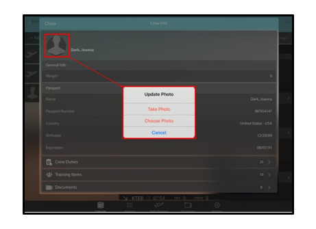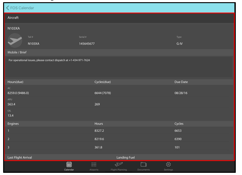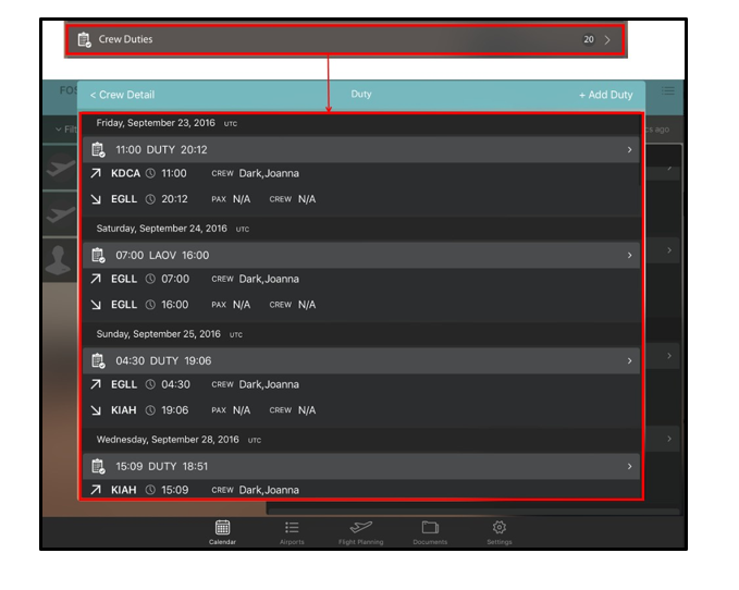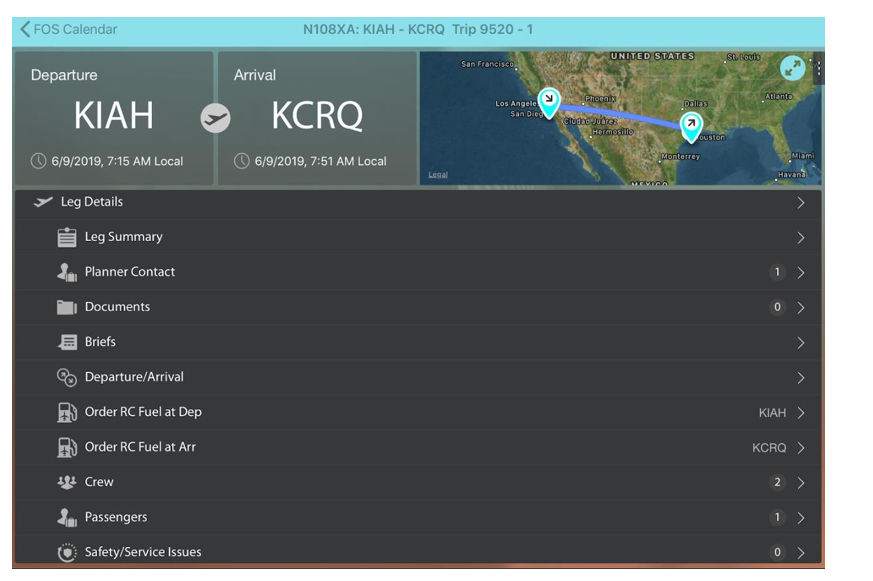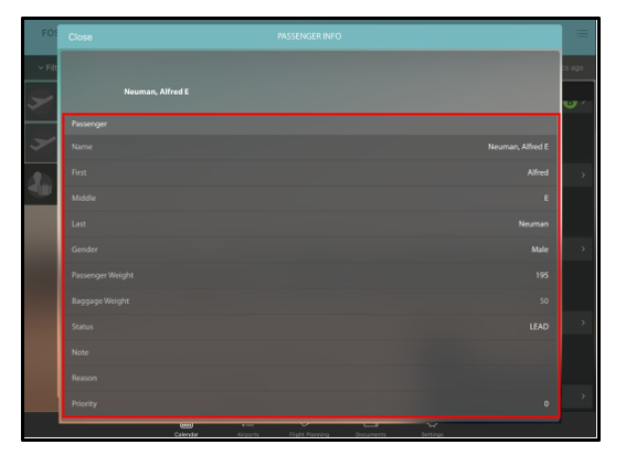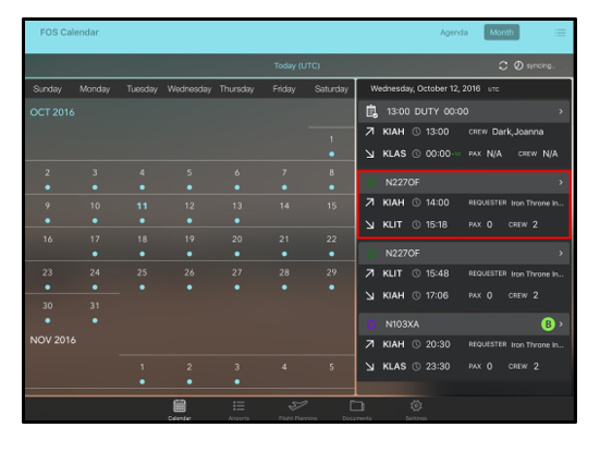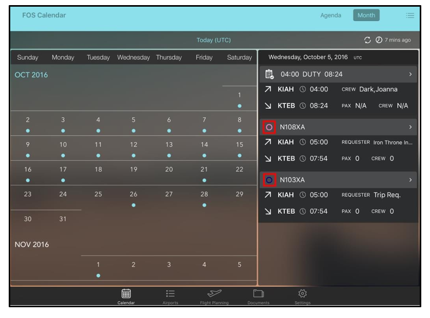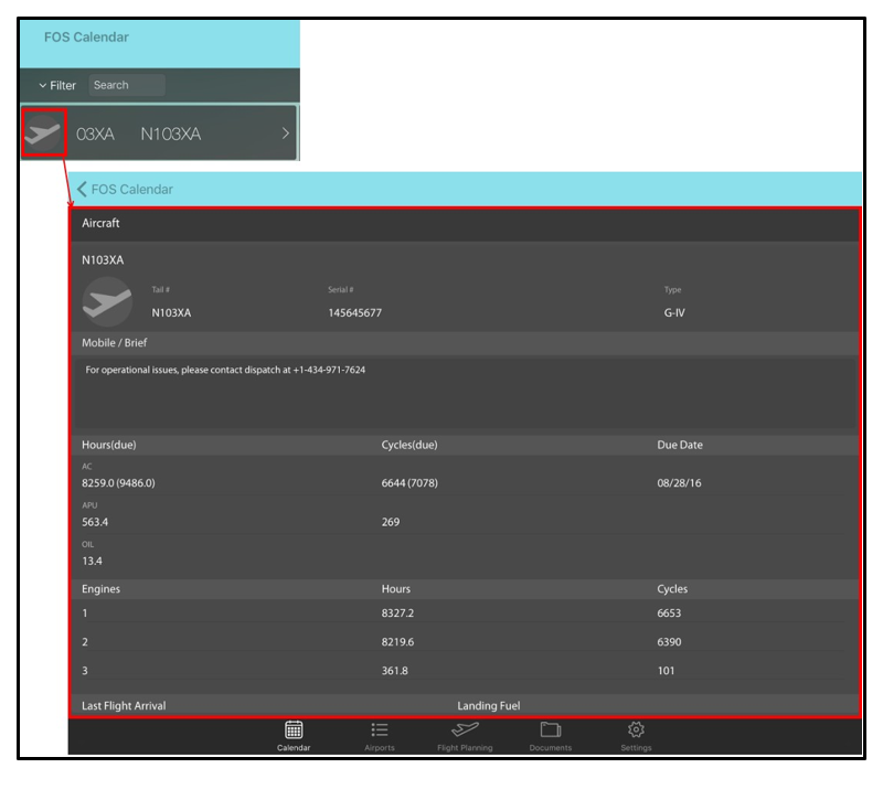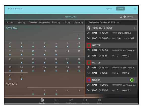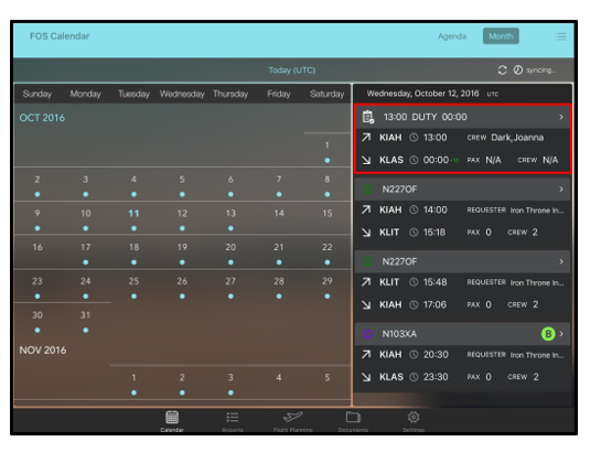 • The aircraft, crewmembers and passengers displayed on the left corresponds with the Mobile settings in the user’s FOS User profile.