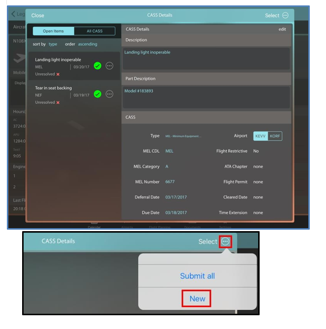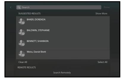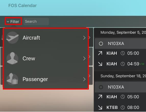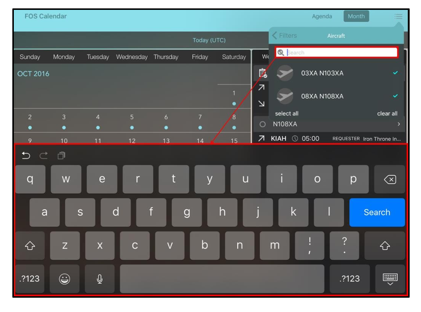 • For longer lists of Aircraft, Crew or Passengers, users may utilize the “Search” field at the top of the filter screen. Enter in the appropriate ID, Tail Number or Name. Select “Search” on the keyboard.