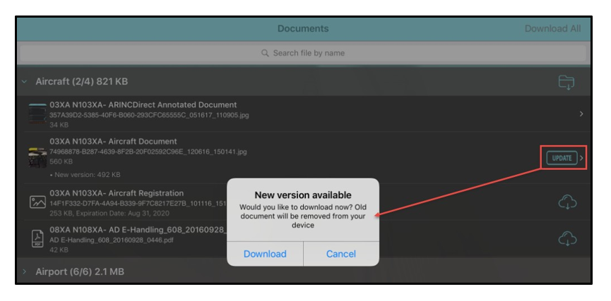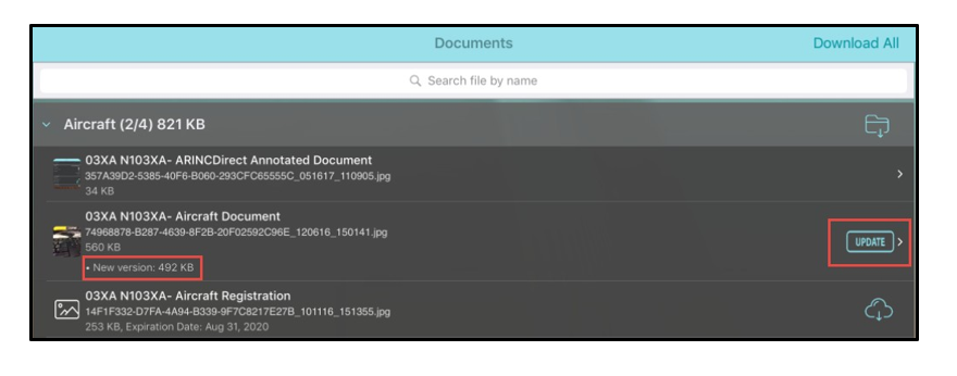 • If a document that was previously downloaded is updated within FOS an update icon will appear next to that document and “New Version” will appear below the document name.