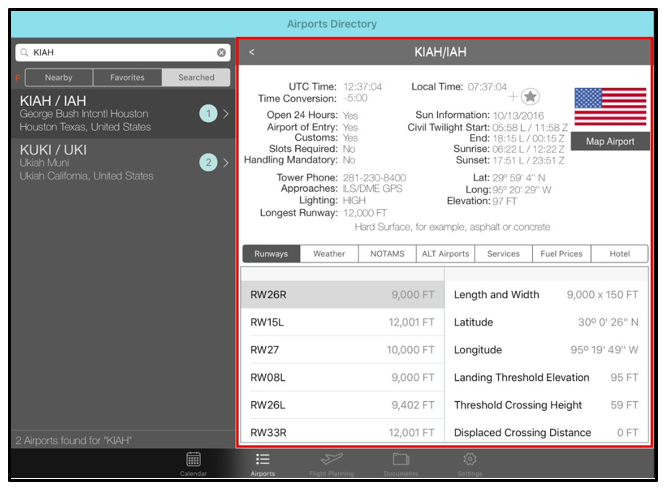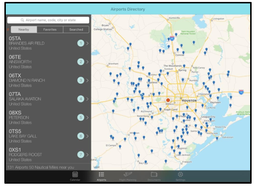 To access the Airport Directory section of the application, select the Airports icon at the bottom bar of the screen. The Airport directory will open to a map and pinpoint the users location (when connected to WIFI or cellular connection).