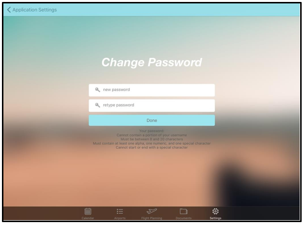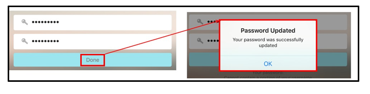 • Enter in the new password. Retype the password in the second field to confirm. Select “Done” when finished. Please note the password requirements.