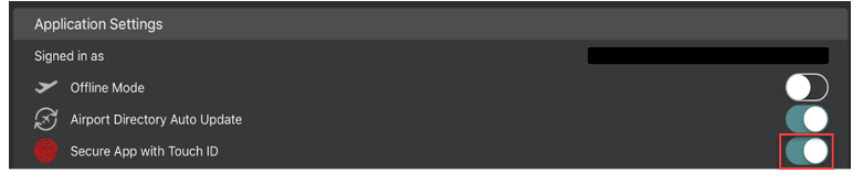• If Touch ID is enabled on the device, an option under Application Settings, called “Secure App with Touch ID,” will display. Slide the toggle switch to the ON position to enable.