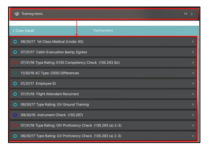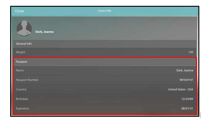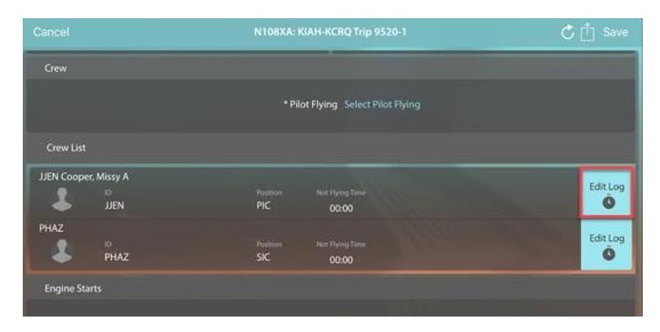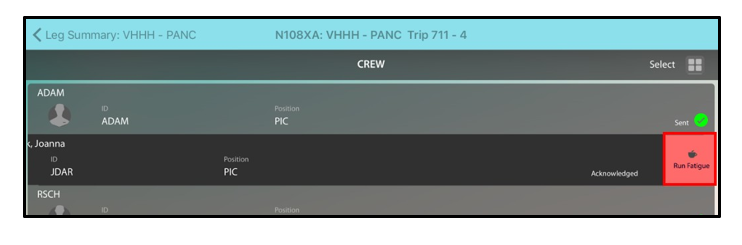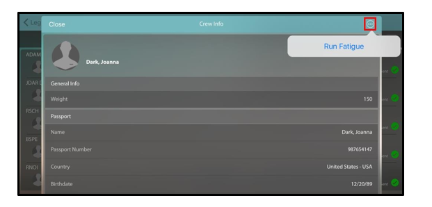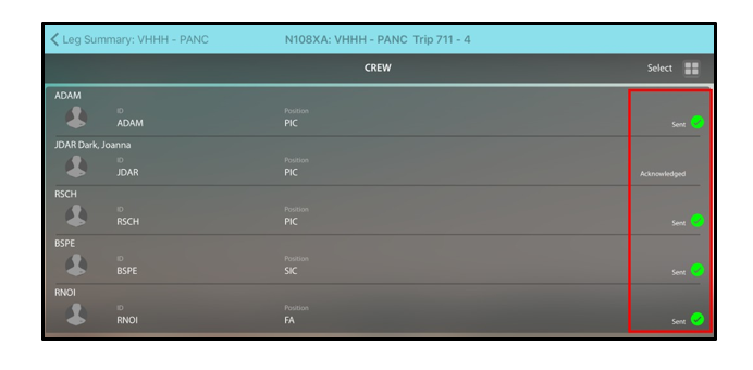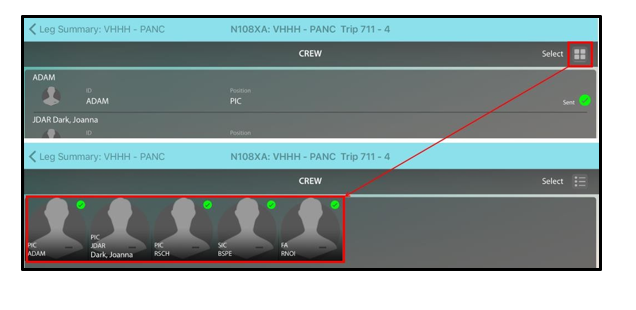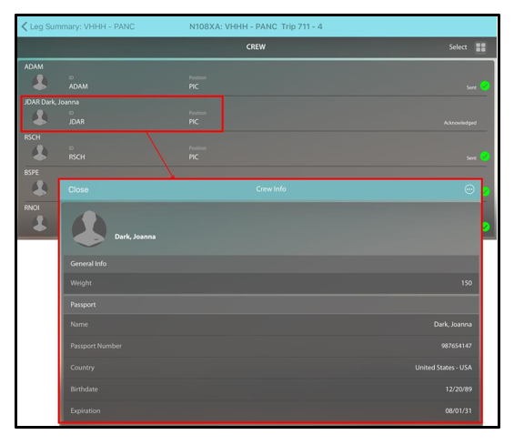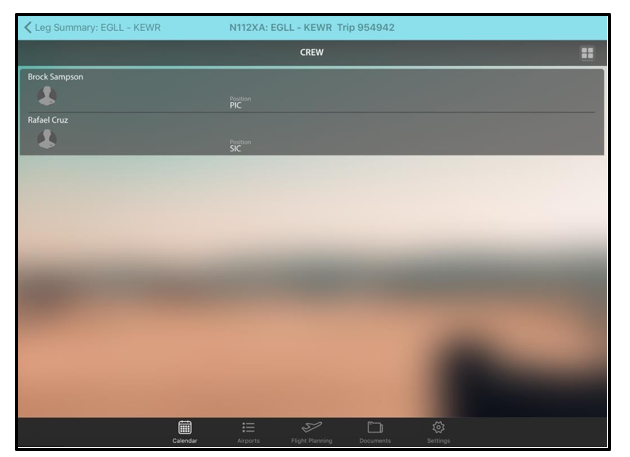 • To view the crewmembers assigned to the leg, along with their assigned position, select the “Crew” option.
