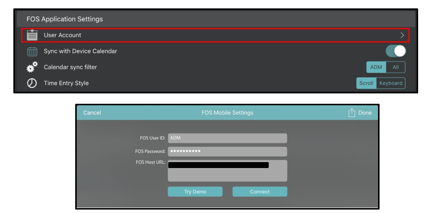 • If the user’s device was synced with unified sign-on, this section will display the FOS User ID, Password and Host URL associated with the FOS database. If not using unified sign-on, these fields may be manually populated.