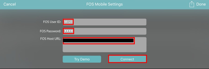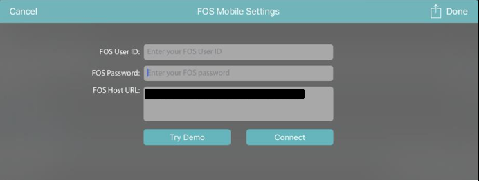 • The FOS Mobile Settings screen will require the User to enter their FOS User ID, Password and Host URL.
