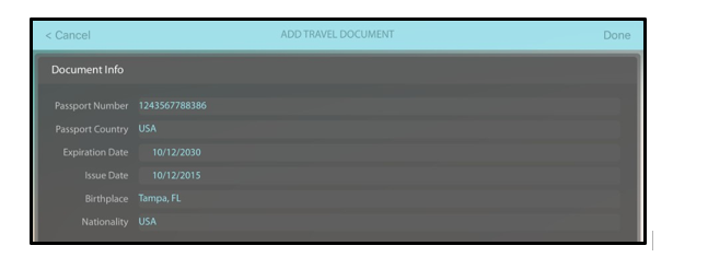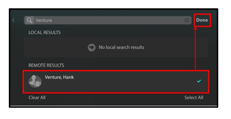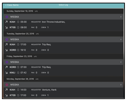 • For the “Search” field, enter in an aircraft, crew or passenger name or ID. As a user types in this field, the results are displayed on the left. After the aircraft, crewmember or passenger displays, select the item to view their schedule on the right. To clear your search, backspace in the “Search” field and select “Done”.