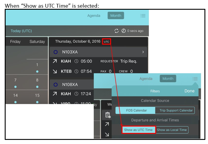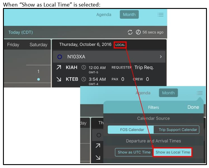 • Users will also notice that when “Show as Local Time” is selected, the top of the calendar will display the time zone of the device. Additionally, the GMT offset for the airport will display next to the departure / arrival times.