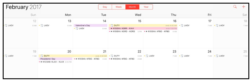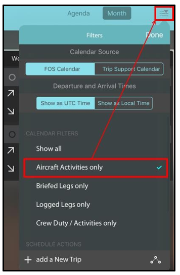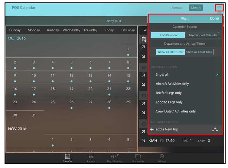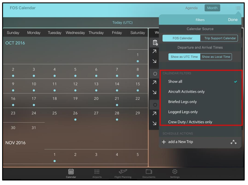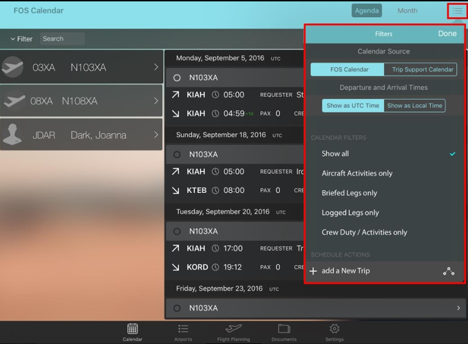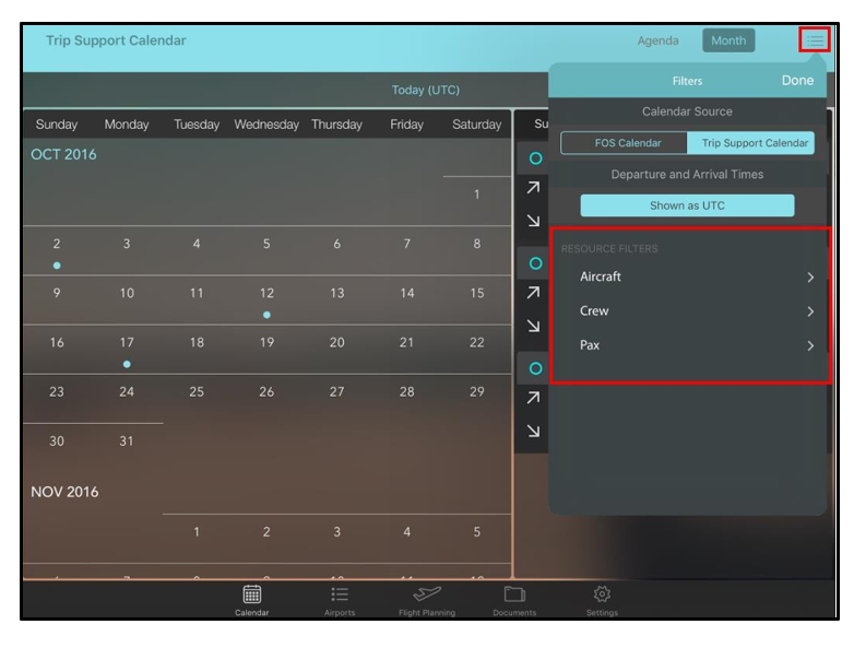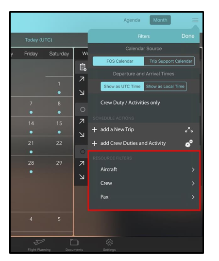 • A limited number of filters, primarily the ability to filter the schedule by Aircraft, Crew, or Passenger may also be applied to the Trip Support Calendar.