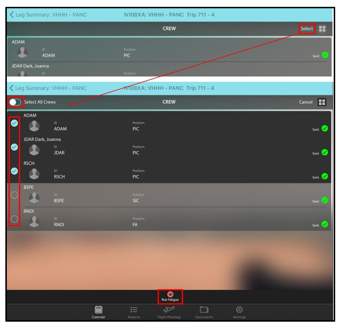 To select multiple crewmembers, tap on each crewmember name. Ensure a blue checkmark is displayed next to their name.