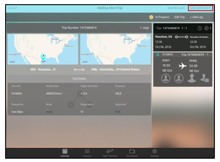 After selecting “Done” a new window will appear with the information that was entered. Select “Save and Submit” to send the new trip to the FOS System.