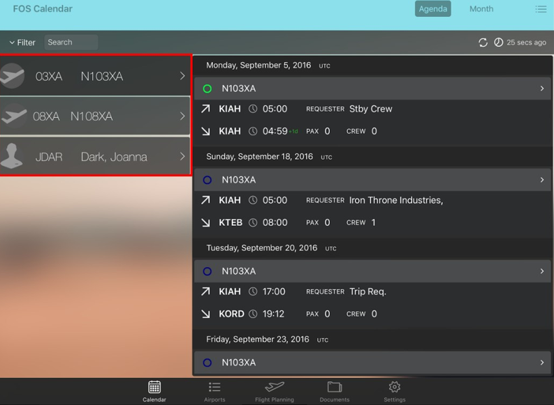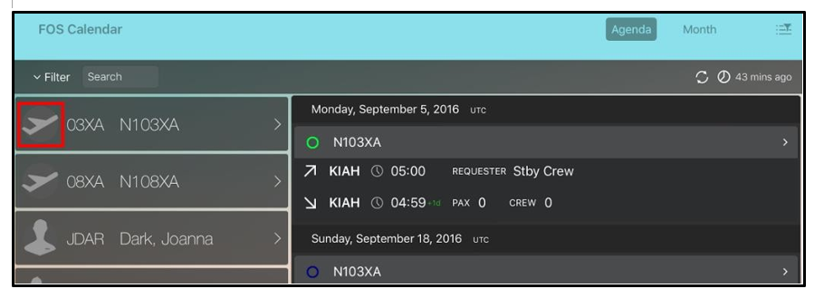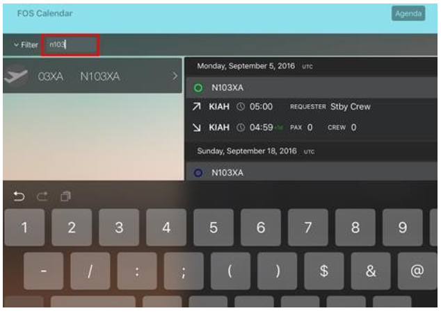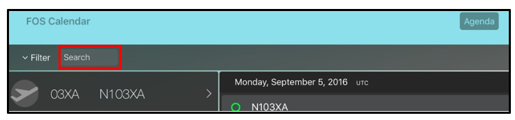 • Quick “Filter” and “Search” fields are located at the top left of the Agenda view. The “Filter” allows for users to quickly apply an aircraft, crewmember or passenger filter to the schedule. The “Search” field allows users to isolate a particular record.