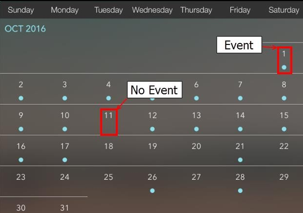 • Select a day on the month view to see more information regarding the FOS schedule. Days marked with a blue coloured circle under the date denote an event for the day. Inversely, days without a blue coloured circle indicate no event.