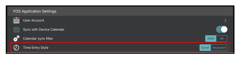 Time Entry Style This setting allows the users to select a preferred format when entering any time entry field within the PORTSIDE FOS application. Users have the option of the Scroll Wheel or 10 Key Number Pad (Keyboard).