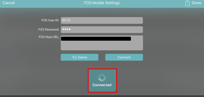 After successful connection, the user will receive a “Connected” message and the FOS Mobile Settings page will retreat.
