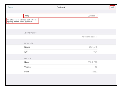 • Type the feedback comments in the space below the “Topic” field. Users will notice in the fields below this section, information about the device and app will also be sent with the feedback. When finished select “Mail.”