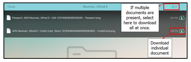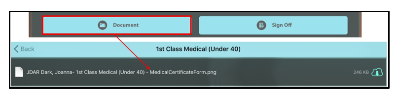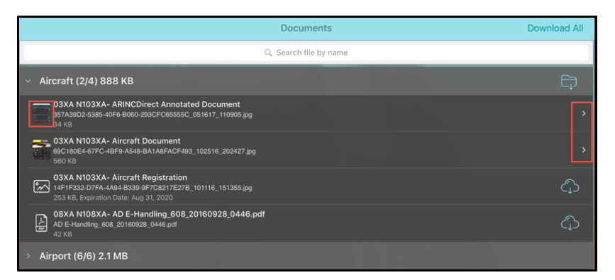 • Documents that have been downloaded onto the device will indicate an arrow to the right of the file name and an image thumbnail to the left of the file name.