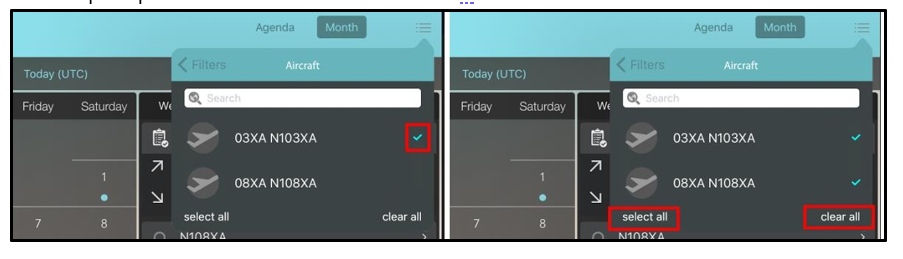 • After selecting an initial resource filter (Aircraft, Crew or Pax), users are presented with a secondary menu to further tailor the list. Users may also utilize the “clear all” or “select all” option presented at the bottom of the menu.