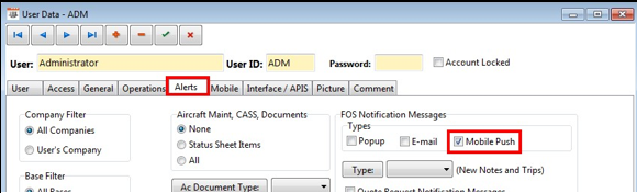 To enable Push Notifications within FOS, open the FOS User profile and select the “Alerts” tab. Then, enable the “Mobile Push” checkbox.