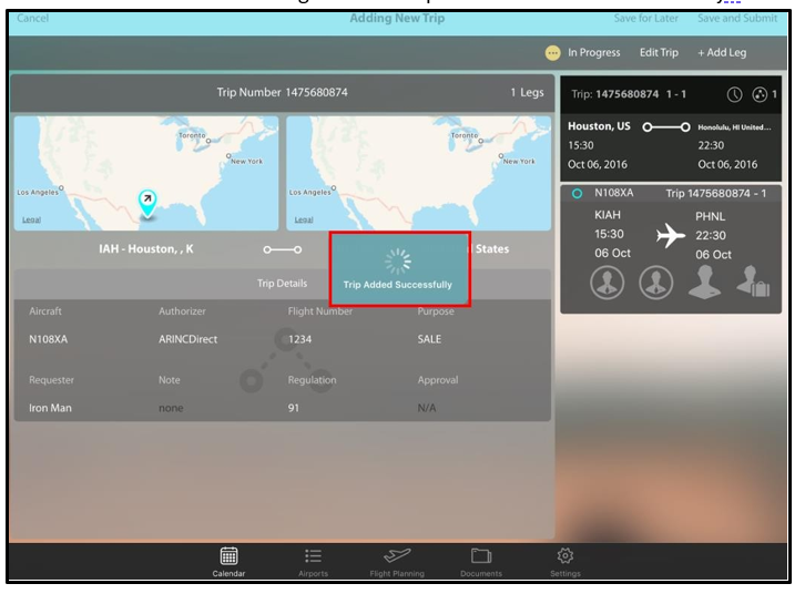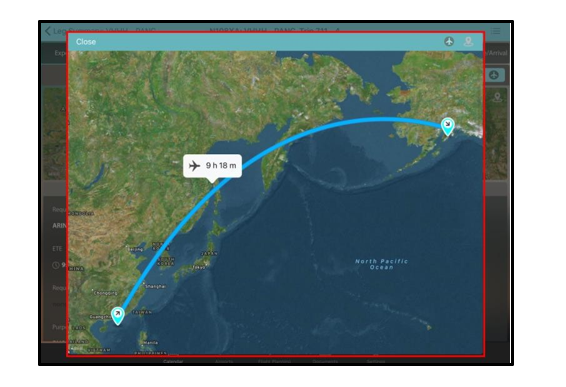• After selecting the leg from the Trip Support Calendar, this will display the Trip Support Trip Number, along with the City Pair, Date/Time and a map showing the great circle routing.
