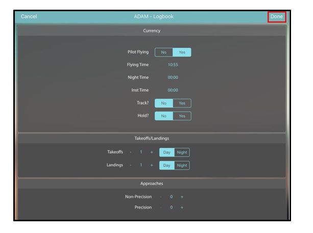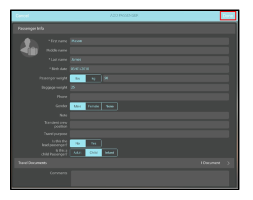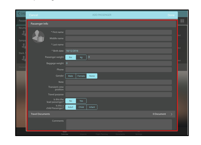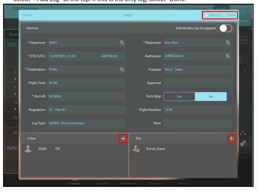 • In the next screen, fill out the additional appropriate fields, such as Departure, Destination, ETD, Flight Time, etc. Use the + by Crew and Pax to add the crewmembers and passengers to the leg. For additional legs, once complete, select “+Add Leg” at the top. If this is the only leg, select “Done.”