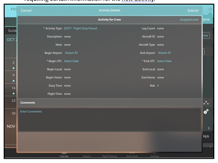 • After selecting “+add Crew Duty and Activity” users are presented with a new window, requiring certain information for the new activity.
