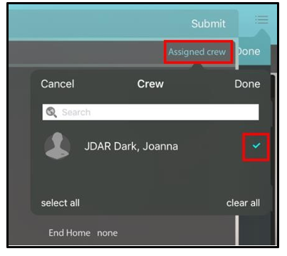 • To assign a crewmember to the activity, select “Assigned crew” at the top right. This will present a drop-down window and display the list of crewmembers that the user is configured to see based on the Mobile settings of the user’s FOS User profile. Tap on the crewmember name to select them for the activity.