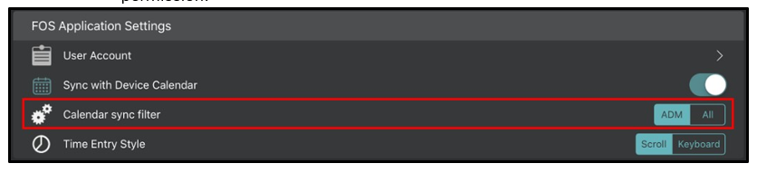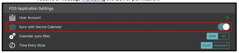 • Please Note: If the user has been assigned the specific permission within FOS Core, “External Cal Assign Only” within the Mobile tab of the FOS User profile, the user will only be able to sync their schedule. If the user tries to activate the “All” sync, the user will receive a message indicating the lack of permission.