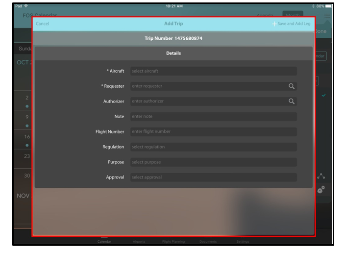 After selecting “+add a New Trip,” users are presented with a new window, requiring certain information for the new trip. Aircraft and Requester are required fields. Additional fields that may be populated are: Authorizer, Note, Flight Number, Regulation, Purpose and Approval.