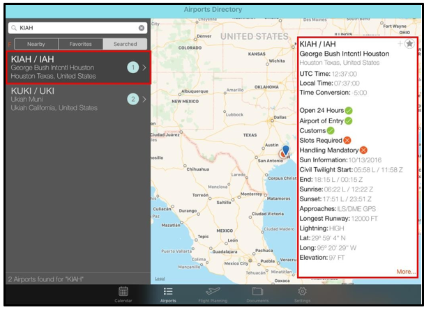 • Select the “More…” option at the bottom right to view additional details about the selected airport.