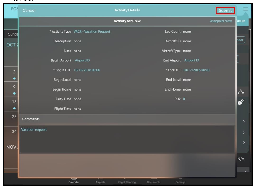 • Enter the additional information for the activity, such as Activity Type, Begin Airport, Begin Date/Time, End Airport and End Date/Time. Select “Submit” after information has been entered. After “Submit” has been selected, the new activity information will be sent to FOS.
