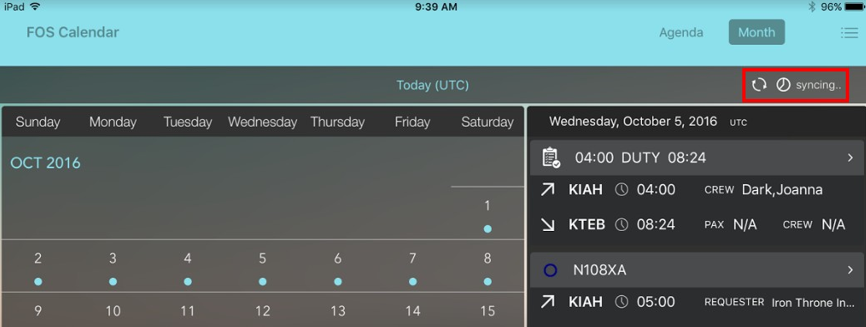• When navigating to the calendar, the application will begin syncing when a WIFI or Cellular Connection is enabled and/or available. The Month View Calendar will display the number of days backwards and forwards that is set in the user’s FOS User profile or the FOS Company Data section.