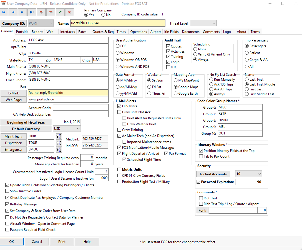 The “General Tab” allows default options for all users assigned to the company that are non-specific in nature as far as their categorization and include items such as the company address, phone numbers, etc. It is imperative that the fields are filled out properly, as the fields will be displayed on various reports if necessary. The address and phone number fields affect the information transmitted to APIS. All fields within the General Tab will be broken down into sections and described in detail within the chapter.
