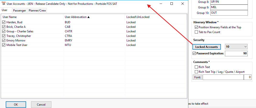 Locked Accounts - Designate whether accounts should be locked after 5 or 10 attempts. By selecting this box it will bring up the locked users menu. To unlock, you will deselect the checkbox and select ok. Permission to unlock comes from the "System Manager" checkbox in the FOS User profile.