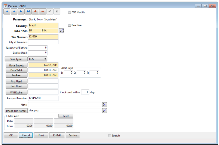 - FOS Mobile - To allow the visa information to be viewed in FOS Mobile, this checkbox must be selected. Please note, in the "Visa Type" code, you can set any visa type code as a "Yes" for FOS Mobile so that each visa record does not need this box checked, as it will take on the default of the code.