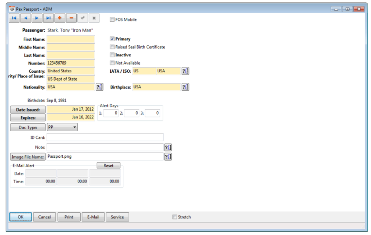 - FOS Mobile - To allow the passport information to be viewed in FOS Mobile, this checkbox must be selected. Please note, in the "Doc Type" code, you can set any doc type code as a "Yes" for FOS Mobile so that each passport record does not need this box checked, as it will take on the default of the code.