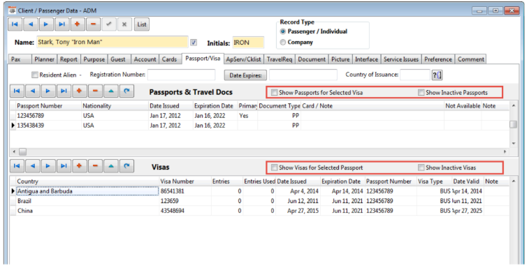 - Show Visas for Selected Passport - If the corresponding Passport Number is filled out within a Visa Record, highlight the Passport record. Then, select the checkbox to filter the Visa list to display the Visa records that contain that Passport Number.