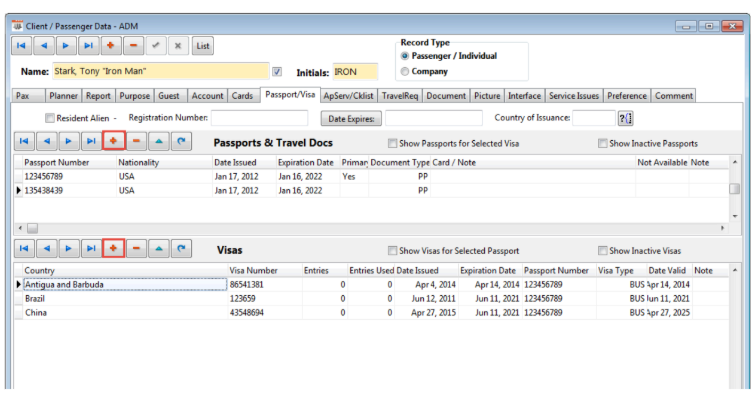 Clicking the + button by the Passports & Travel Docs heading or the Visas heading, will create a new Passport or Visa Record.