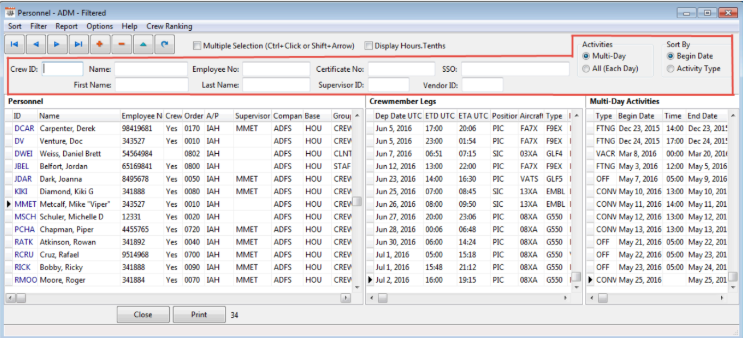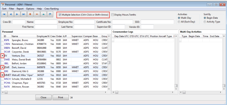 To select several personnel records for reporting purposes, select the Multiple Selection checkbox. Use the following keyboard/mouse commands Ctrl+Click or Shift+Arrow.