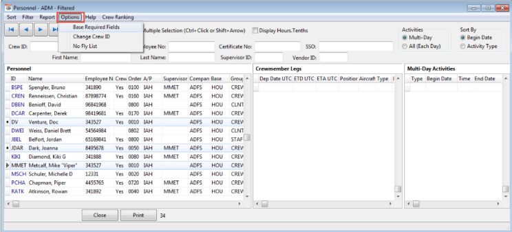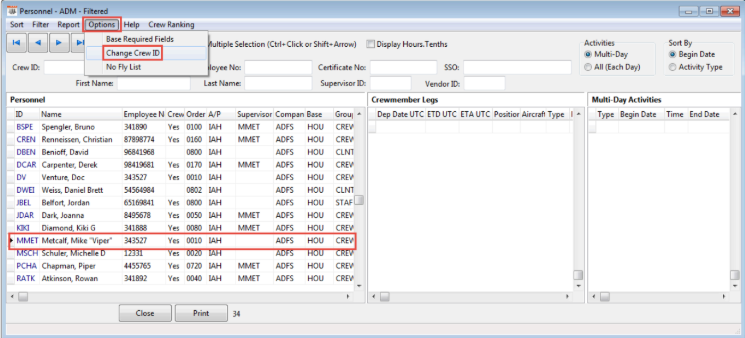Please note, users must have appropriate permissions to perform the following and the crew ID may ONLY be changed by using the “Change CREW ID” option under the “Options” drop down selection. Please be sure to follow